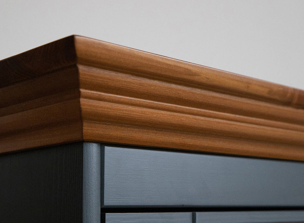 Diese elegante Vitrine aus finnischem Kiefernholz wurde für eine langlebige Nutzung konzipiert. Das robuste Holz stammt aus nachhaltiger Forstwirtschaft und wurde mit wasserbasiertem Graphit-Lack (Deckkraft 90 %) veredelt, sodass die natürliche Maserung sichtbar bleibt. Der obere Kranz und die Ablagefläche in warmem Eichenholzton setzen dabei einen stilvollen Kontrast.