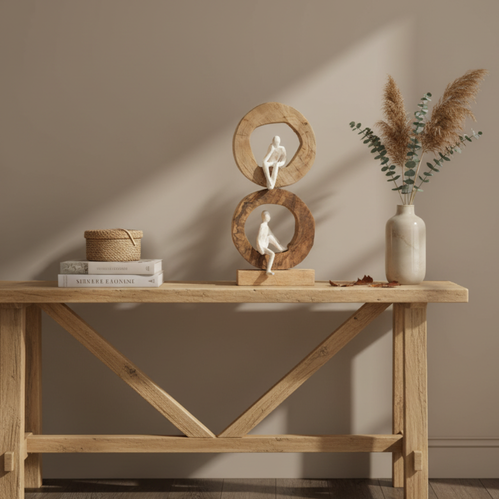 Ontdek de handgemaakte sculptuur "Double Thinker Rings", een indrukwekkend unicum van mangohout en aluminium in naturel en wit. Deze eigentijdse sculptuur met twee harmonisch gerangschikte denkersfiguren is een blikvanger in elke ruimte en onderstreept je liefde voor stijlvol, modern en creatief interieurdesign.