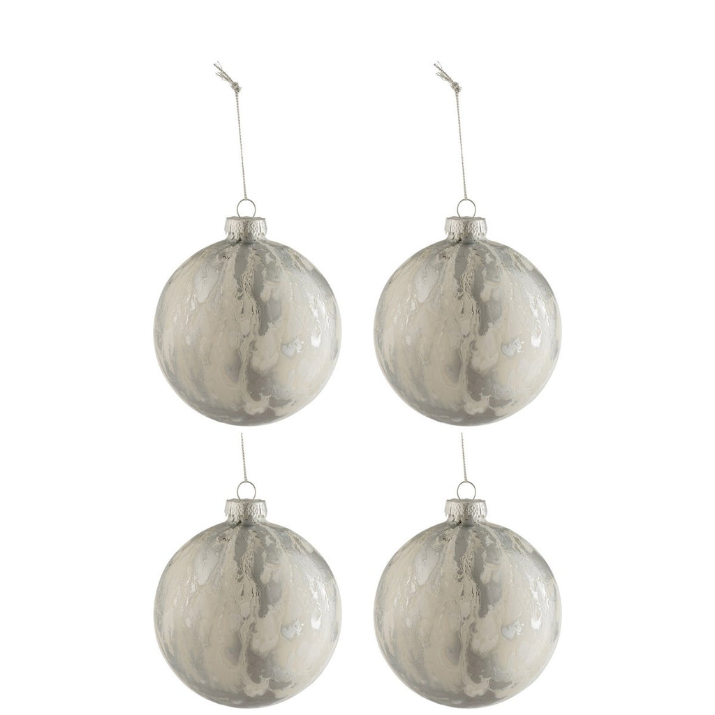 J-Line Doos met 4 kerstballen, marmerlook, glas, wit/zilver, medium