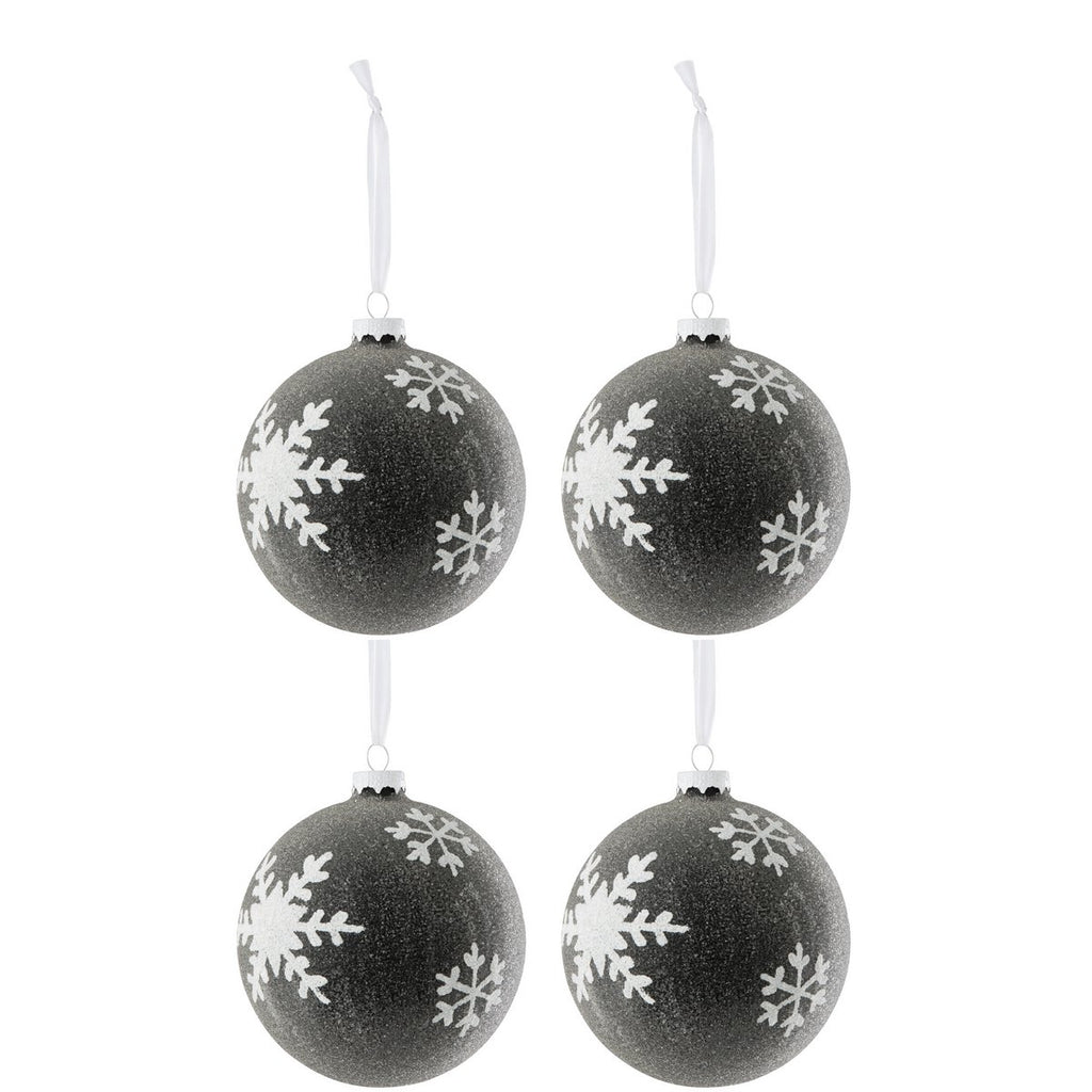 Doos met 4 kerstballen, parels + sneeuwvlok, glas, grijs, donkerwit, groot