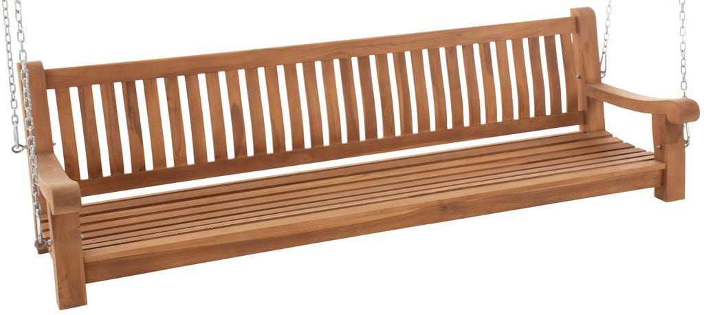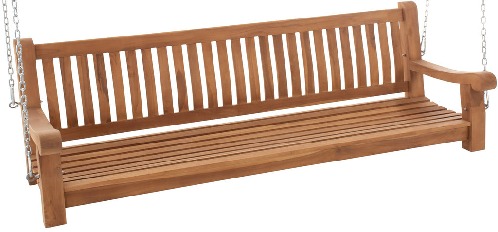 Met zijn eenvoudige uiterlijk en de goudbruine kleur van het teakhout oogt de tuinschommel chic en is hij te combineren met diverse interieurstijlen. De bank is ideaal om te ontspannen. Het zitvlak is licht gebogen, waardoor het ook zonder kussens comfortabel zit. De teakhouten bank heeft ook armleuningen aan de zijkanten.