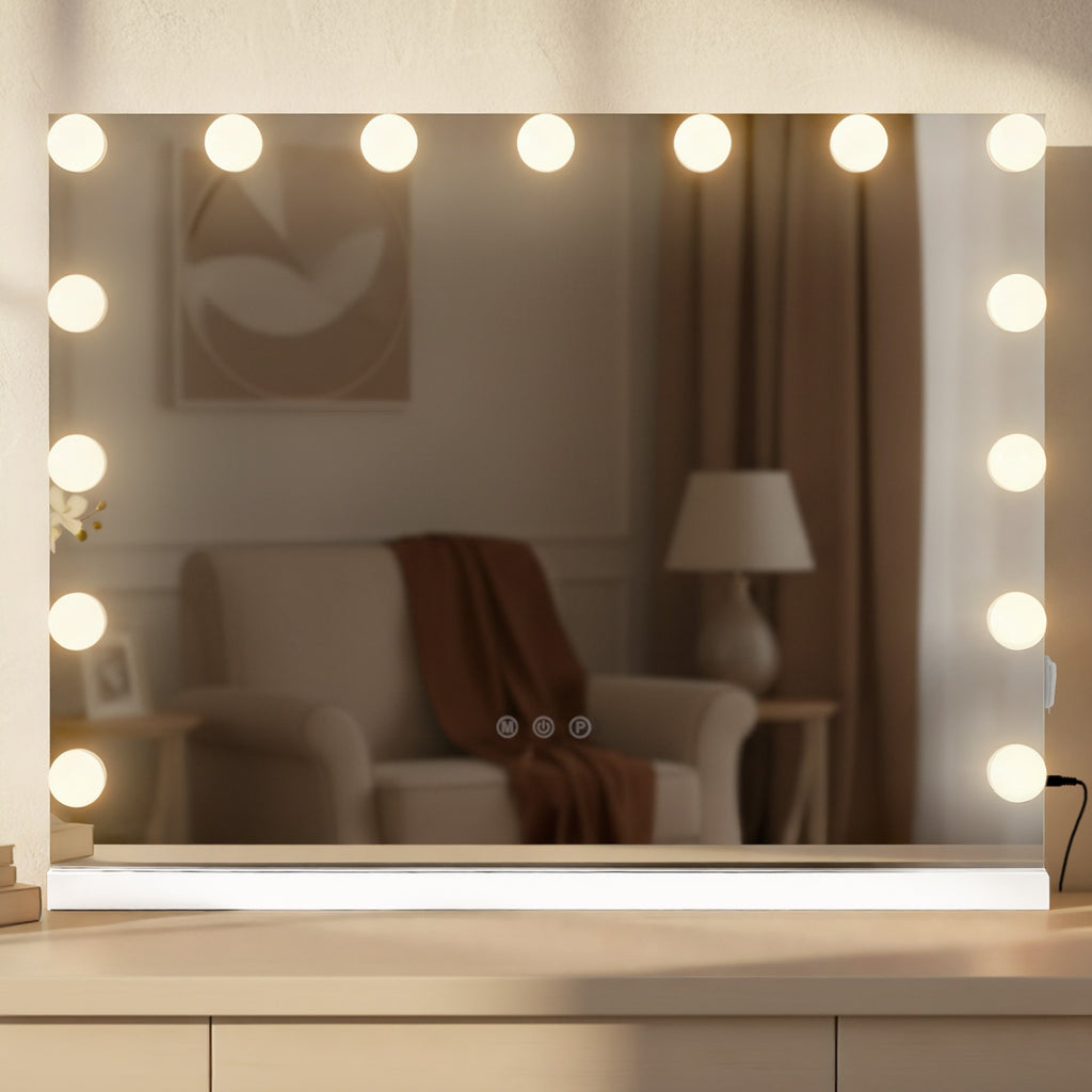 De veelzijdige Hollywood-spiegel kan op een standaard worden geplaatst of aan de muur worden bevestigd. Vijftien energiezuinige ledlampen zorgen voor optimale verlichting met drie lichtstanden (warm wit, neutraal wit, koel wit) en traploze dimfunctie. Dankzij de slimme geheugenfunctie onthoudt hij de laatste instelling, die via een touchpad wordt bediend.