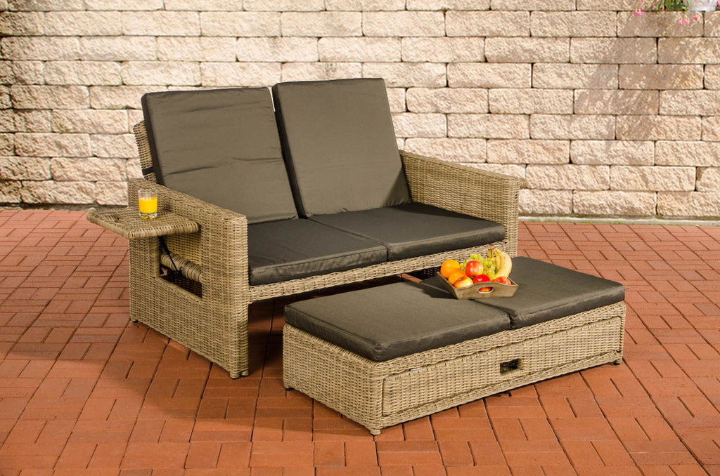 Deze 2-zitsbank is meer dan een conventionele zitbank. Dankzij de individueel in hoogte verstelbare rugleuningen en een extra voetsteun kan deze bank ook als ligstoel worden gebruikt. De aan de zijkant uitklapbare planken kunnen gebruikt worden voor drankjes of eten en zorgen zo voor puur comfort. Een ander extraatje is het uitschuifbare voetengedeelte, dat indien nodig zelfs ruimte biedt voor kussens of dekens. Uiteraard zijn alle edities bij de levering inbegrepen. De rugleuning kan volledig horizontaal worden geplaatst.