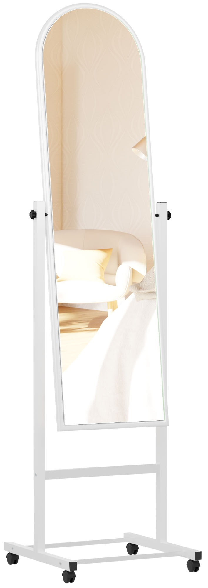 De spiegel is handig traploos draaibaar en kan worden vastgezet. De grote spiegel heeft een stevig metalen frame en een MDF-achterpaneel en staat op vier kunststof wieltjes die 360 graden draaien, waardoor hij gemakkelijk te verplaatsen is.