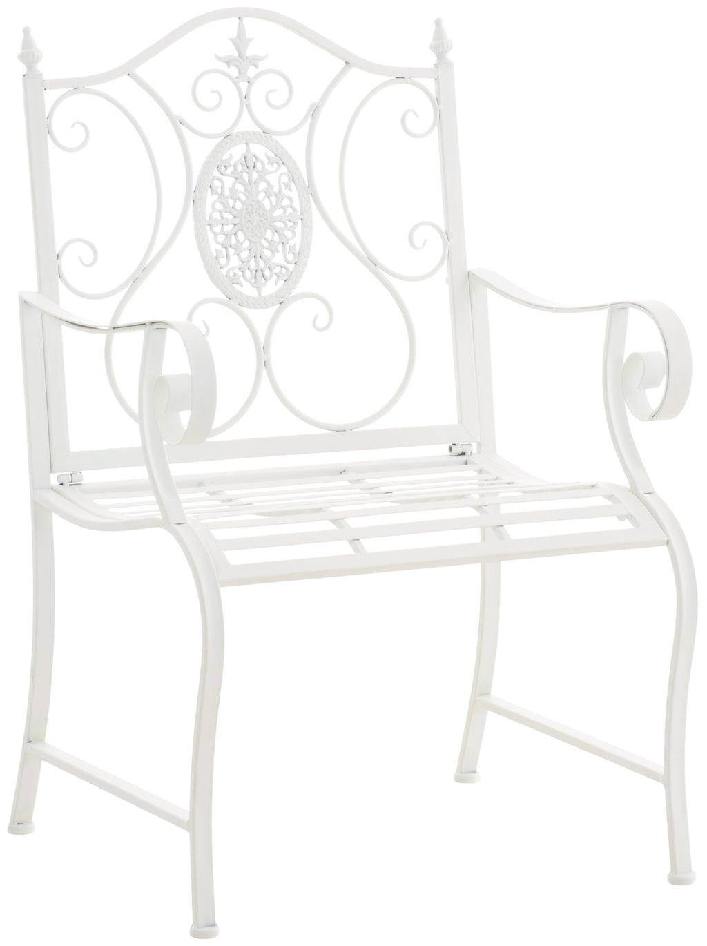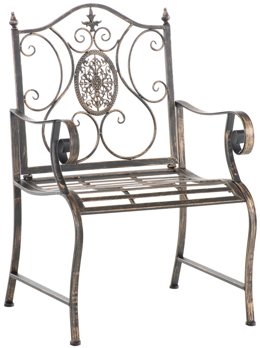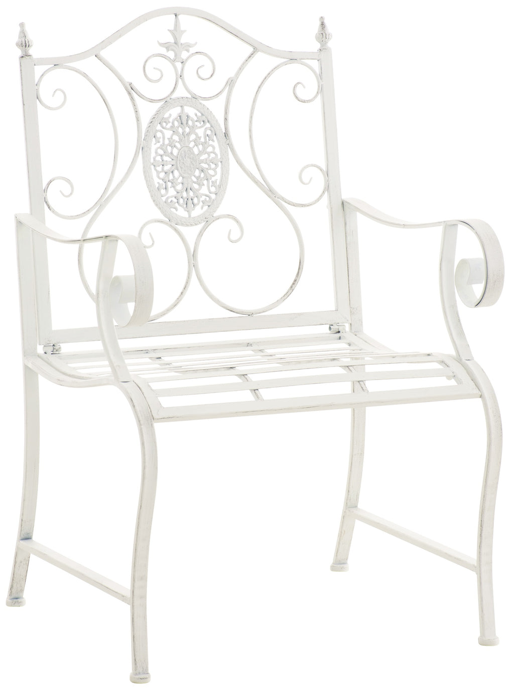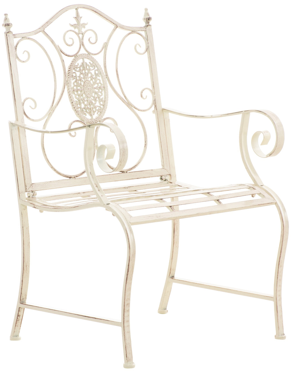 De stoel is gemaakt van geverfd ijzer. Hij is gemakkelijk te onderhouden en kan worden gereinigd met een vochtige doek en een mild schoonmaakmiddel. Het oppervlak van de tuinstoel is afgewerkt met een prachtige patina, passend bij de prachtige decoraties. Bescherm de tuinstoel tegen directe weersinvloeden.