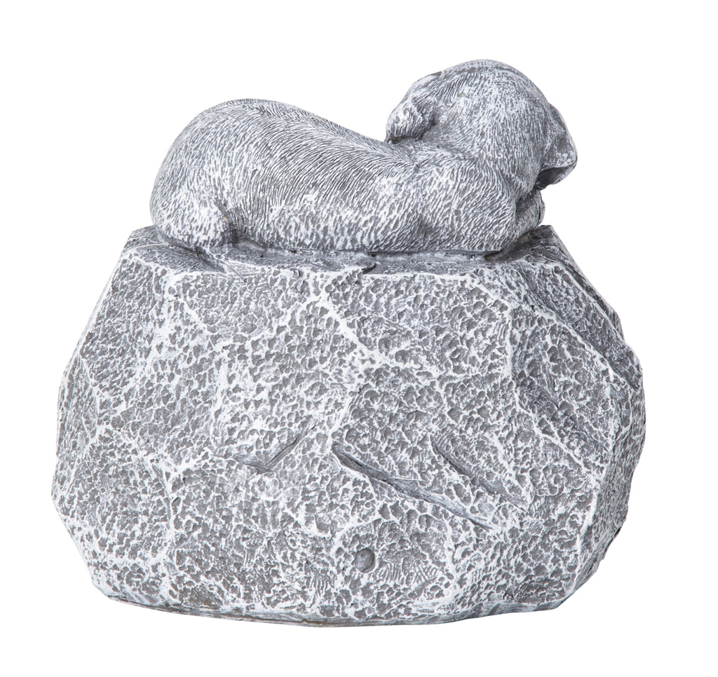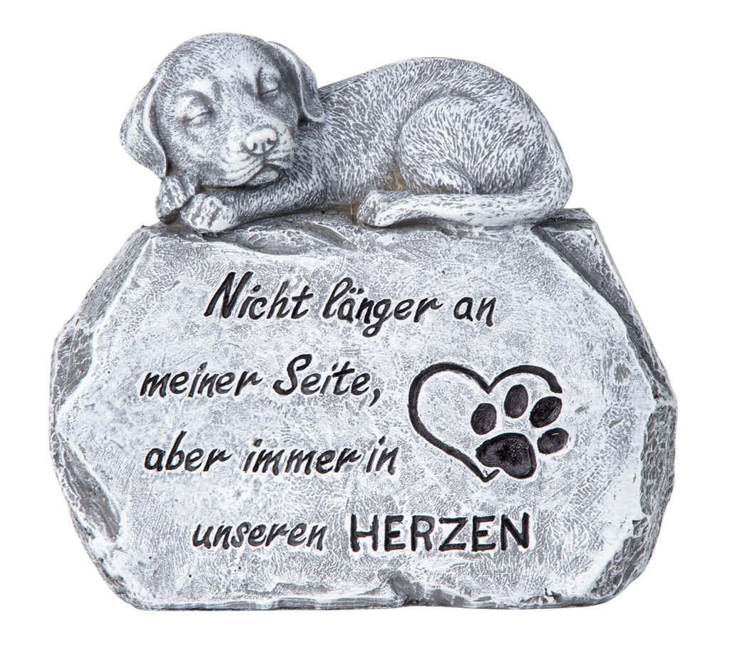 Die Figur Hund auf Grabstein ist ein einfühlsames Dekorationsstück, das Erinnerung und Verbundenheit ausdrückt. Detailreich gearbeitet zeigt sie einen Hund, der treu auf einem Grabstein ruht – ein Symbol für Liebe, Treue und Abschied. In dezentem Grau gehalten, fügt sich die Figur würdevoll in jedes Umfeld ein und eignet sich besonders für Gedenkplätze im Garten oder auf dem Friedhof.