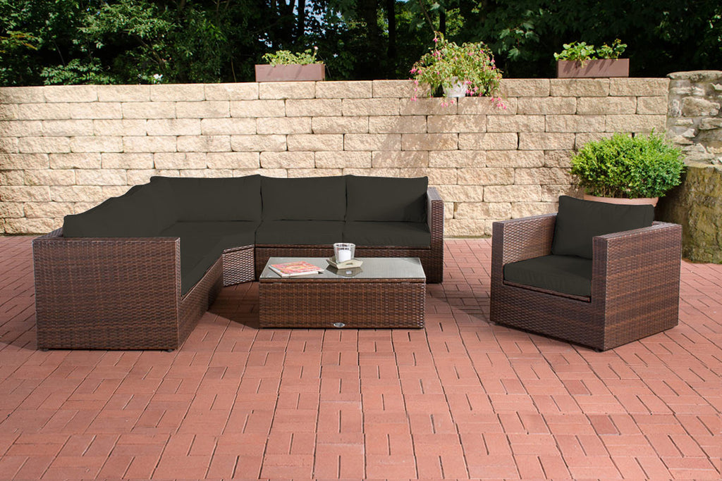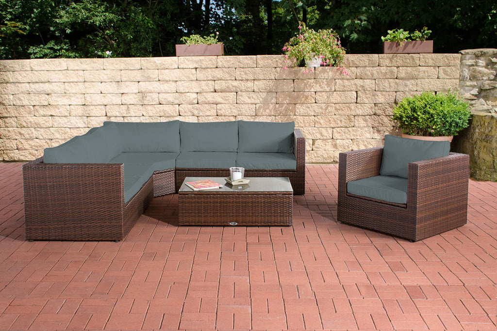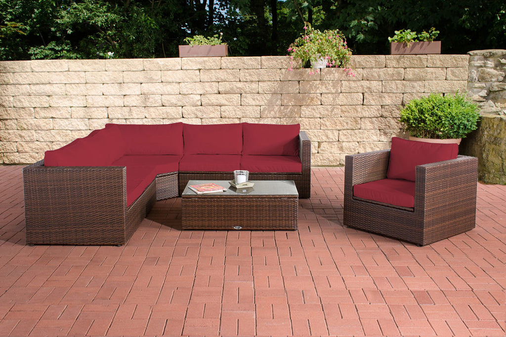 Es handelt sich hierbei um ein komplettes Set Bezüge zu der Gartengarnitur Tibera in fünf verschiedene Farben: Anthrazit, Cremeweiß, Eisengrau, Rubinrot oder Terrabraun.