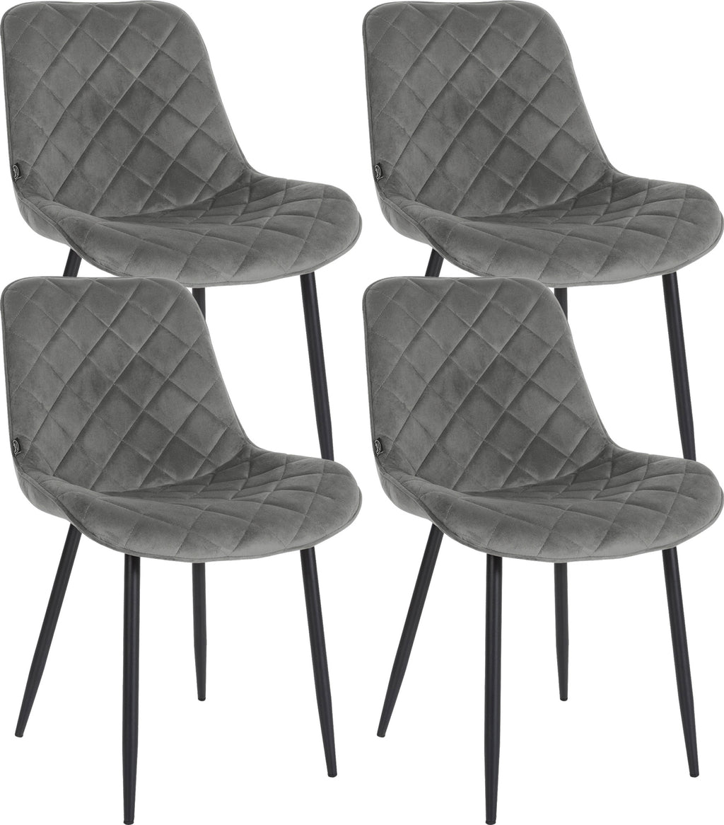 Das 4er Set Stühle Springs mit Samtbezug bereichert wohnlich moderne Räumlichkeiten perfekt und zieht in jedem Raum die Blicke auf sich. Mit seiner komfortablen Rückenlehne und der gesteppten Polsterung ermöglicht er auch langanhaltenden Sitzkomfort. Die Verwendung pflegeleichter Materialien gewährleistet eine mühelose Reinigung des Esszimmerstuhls zu jeder Zeit. Getragen von einem zeitgemäßen 4-Fuß Metallgestell präsentiert sich der Stuhl bei jeder Gelegenheit vorteilhaft. Zudem sind Bodenschoner an den Füßen angebracht, um den Boden vor Kratzern zu schützen.