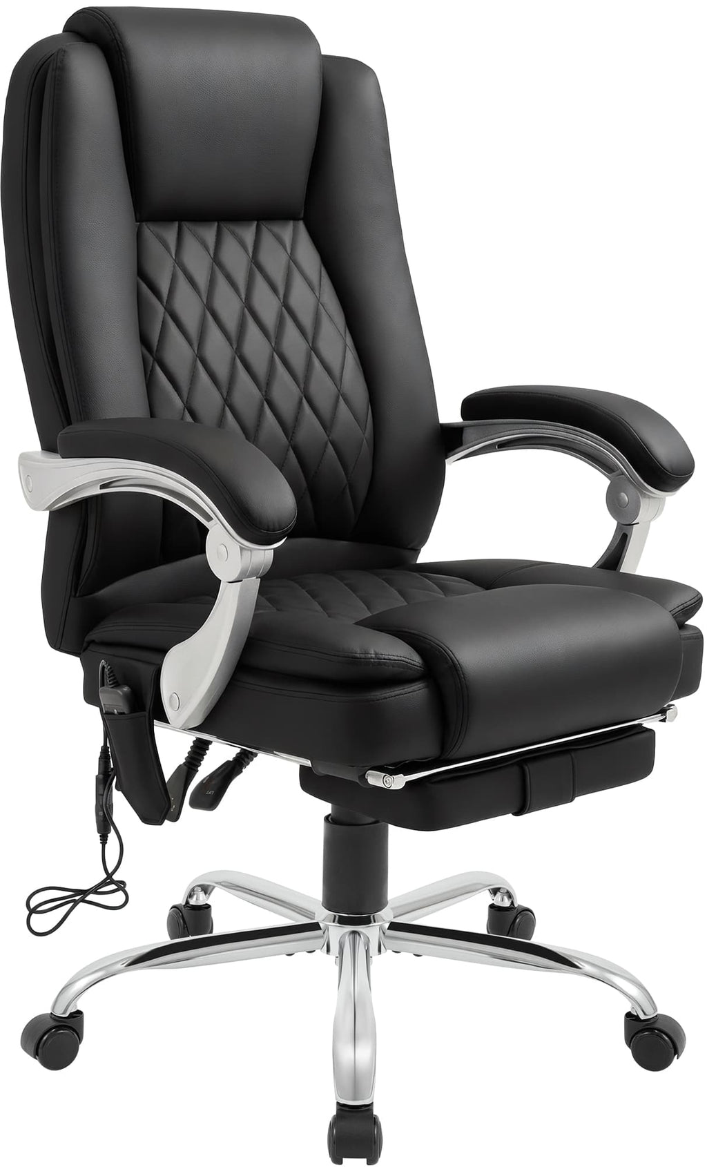 Das Gestell aus robustem Metall in Chromoptik bietet Stabilität bis zu einer Belastung von 150 Kilogramm. PU-Rollen und die drehbare Konstruktion bringen Flexibilität und Bewegungsfreiheit im Arbeitsbereich. Die gepolsterten Armlehnen und die herausziehbare Fußablage erhöhen den Sitzkomfort, ergänzt durch den ergonomischen Taschenfederkern und den strapazierfähigen Kunstlederbezug.