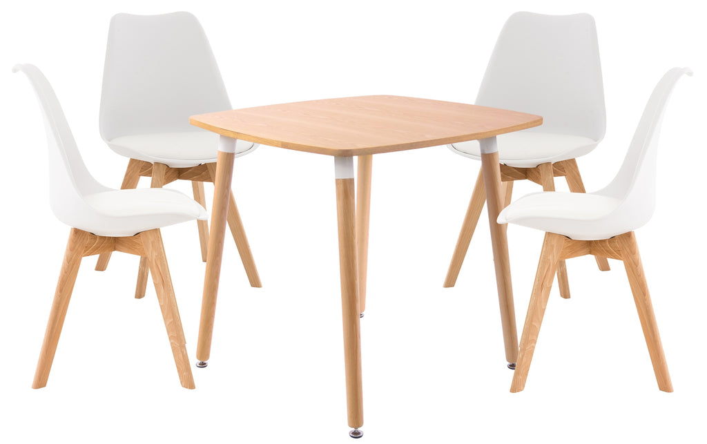 Optisch harmonieren die Applikationen aus Buchenholz an Tisch und Stühlen ideal miteinander, sodass sich ein stimmiges und modernes Gesamtbild ergibt.