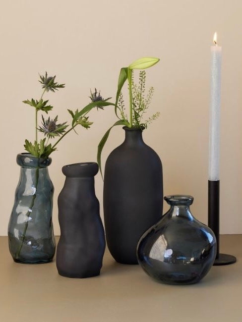 Organisch geformte Glasvase aus recyceltem Glas. Matt schwarz gefärbt, handgefertigte Produktion. Ideal für kleine Blumensträuße oder einfach zur Dekoration geeignet.