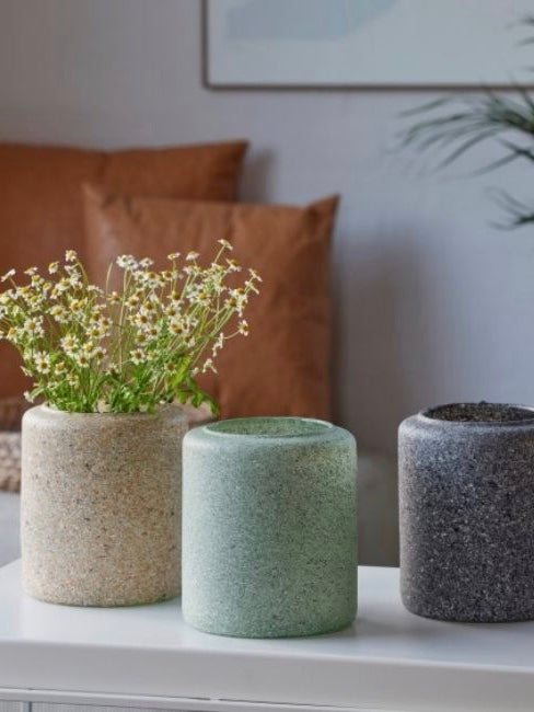 Effektvolle, handgefertigte Vase aus recyceltem Glas. Die Oberfläche ist wie Granit behandelt und dunkelgrau eingefärbt. Ideal für kleine Blumensträuße oder einfach zur Dekoration geeignet.