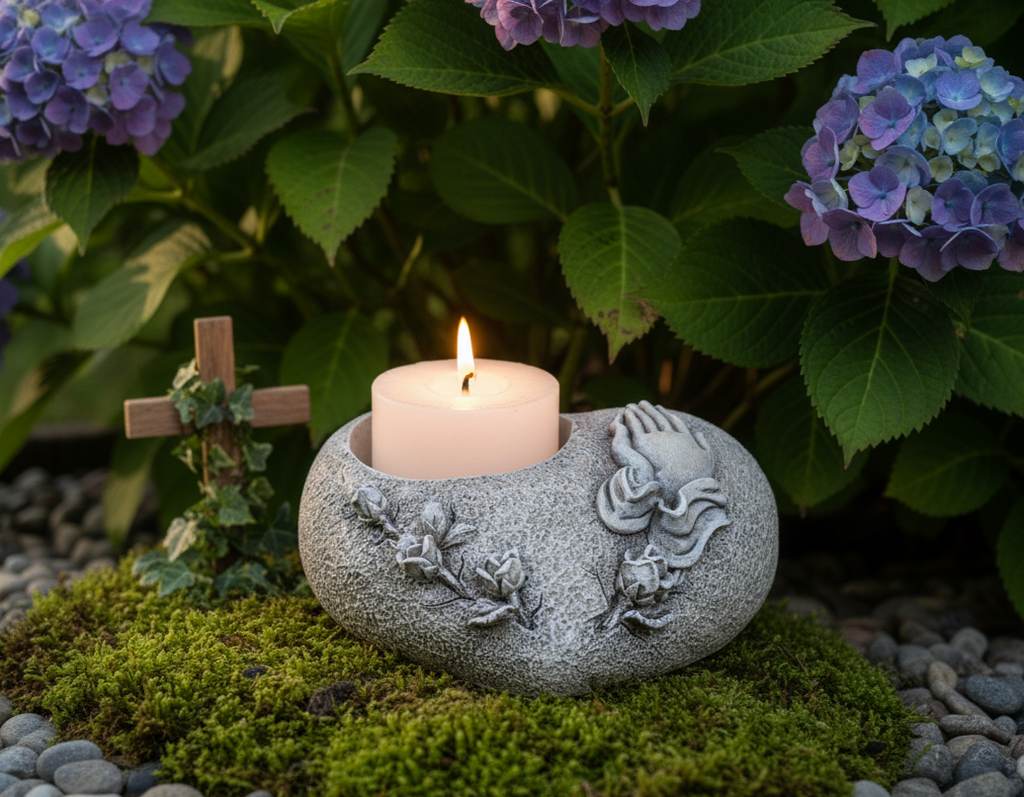 Ein stiller Ausdruck von Gedenken und Verbundenheit – das Grabherz Stilles Gebet ist eine liebevolle Grabdekoration, die durch ihre feine Gestaltung tief berührt. Die detailreich gearbeiteten betenden Hände in der Mitte symbolisieren Frieden, Hoffnung und Gebet. Das graue Herz ist aus hochwertigem Polyresin gefertigt und besitzt eine zentrale Aussparung, ideal für eine Grabkerze oder ein Teelicht. Die edle Steinoptik und die harmonische Formgebung machen dieses Grabherz zu einem würdevollen Schmuckstück für jede Ruhestätte.