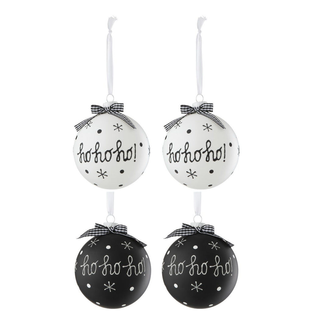 J-Line Box mit 4 Weihnachtskugeln, 2+2 Hoho+Schneeflocken+Schleife, Glas, Schwarz/Weiß, groß