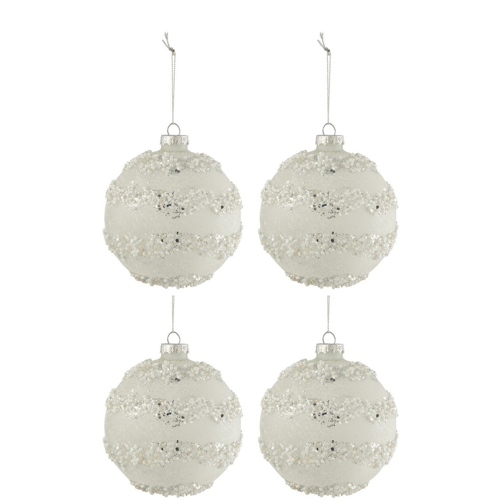 J-Line Box mit 4 Weihnachtskugeln Linien Glitzer+Perlen Weiß/Silber Glas Mattweiß Medium