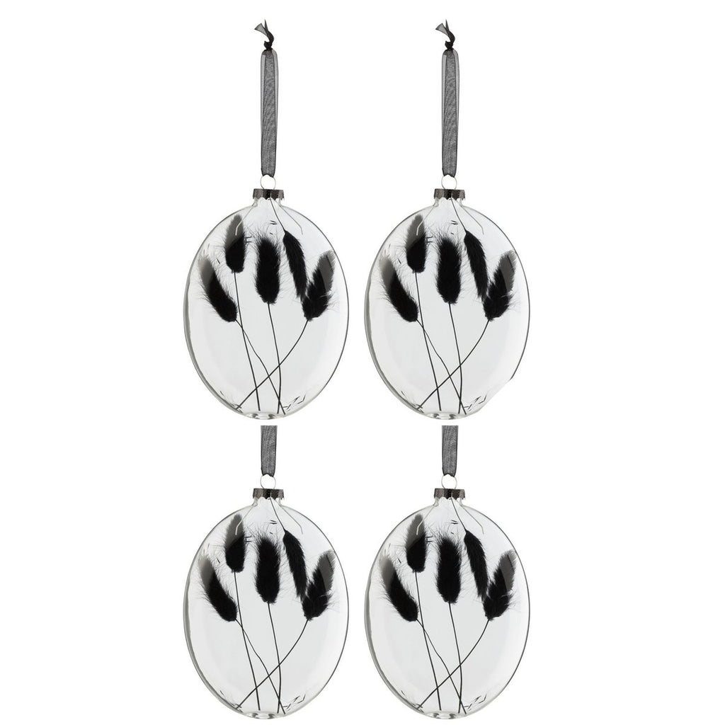 J-Line Box mit 4 Weihnachtskugeln, oval, flach, getrockneter Hasenschwanz, schwarzes Glas, transparent, groß