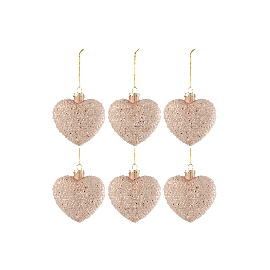 Box mit 6 Weihnachtskugeln, Herz, glitzerndes Glas, glänzend, hellrosa, klein