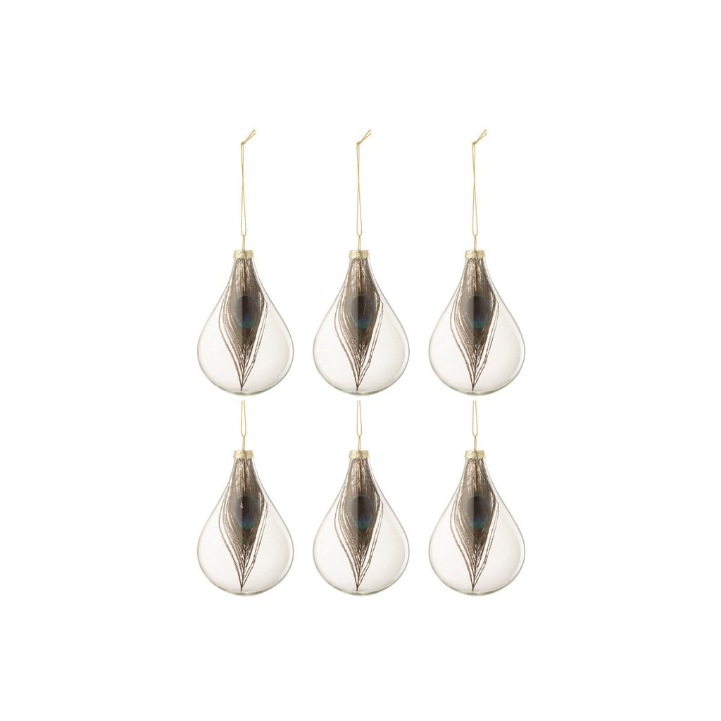 J-Line Box mit 6 Weihnachtskugeln, Tropfenpfauenfeder, Glas, transparent, klein