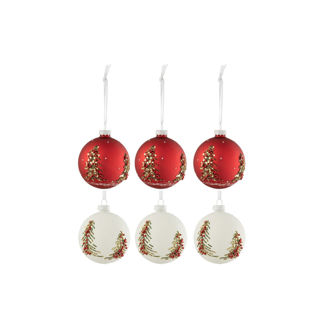 Box mit 6 Weihnachtskugeln, Weihnachtsbäumen, glitzerndes Glas, Weiß/RD, klein