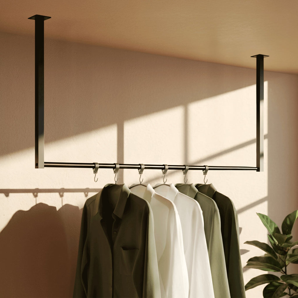 Besonders ist die Deckenmontage, welche auch viele Kombinationsmöglichkeiten bietet. So kann die Halterung bspw. mit einer Kommode, einem Sideboard oder einem Schuhregalen kombiniert werden. Mit ausreichend Platz für Jacken, Hemden und Blusen hält diese offene Kleiderstange die Kleidung knitterfrei und stets griffbereit.