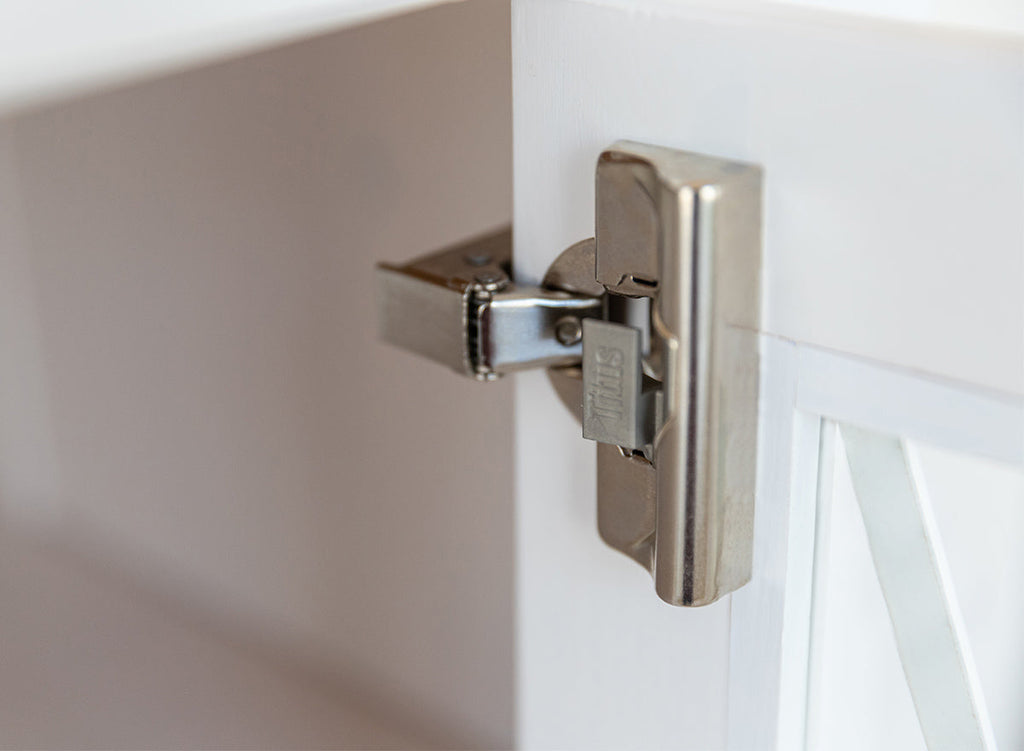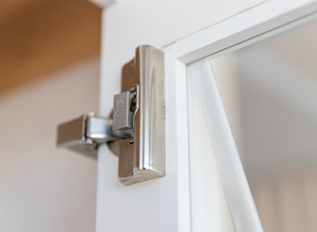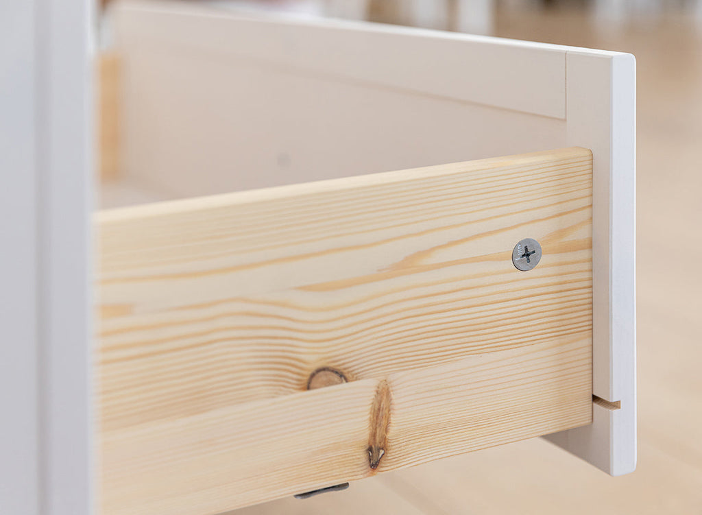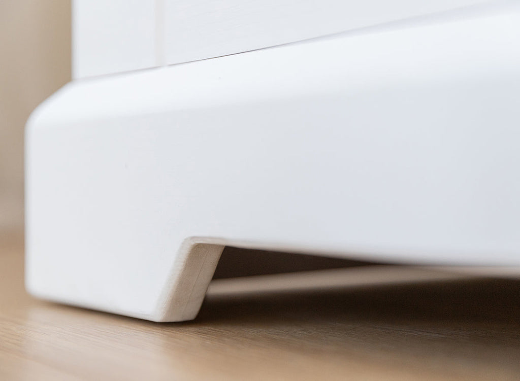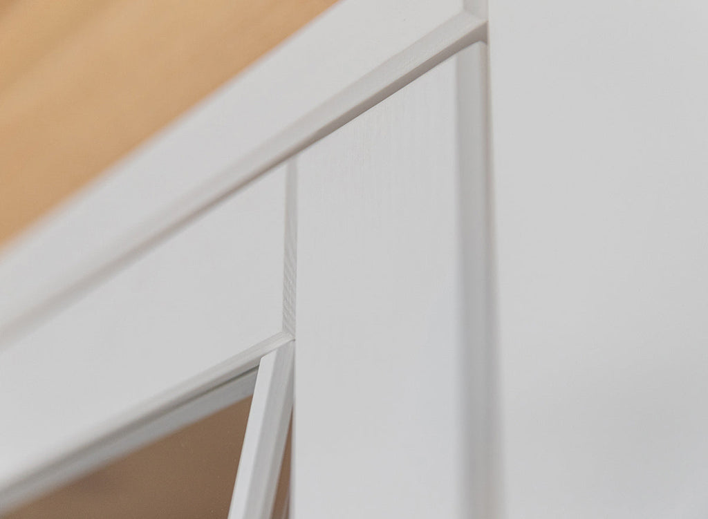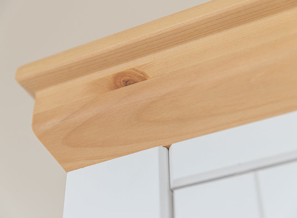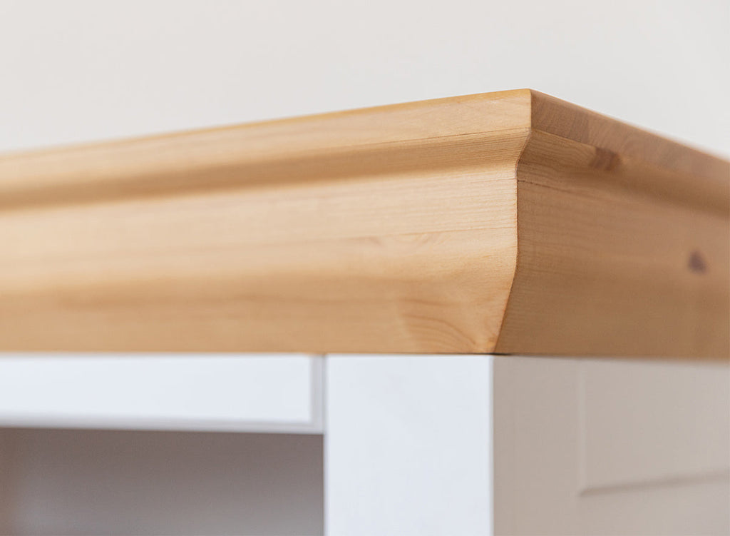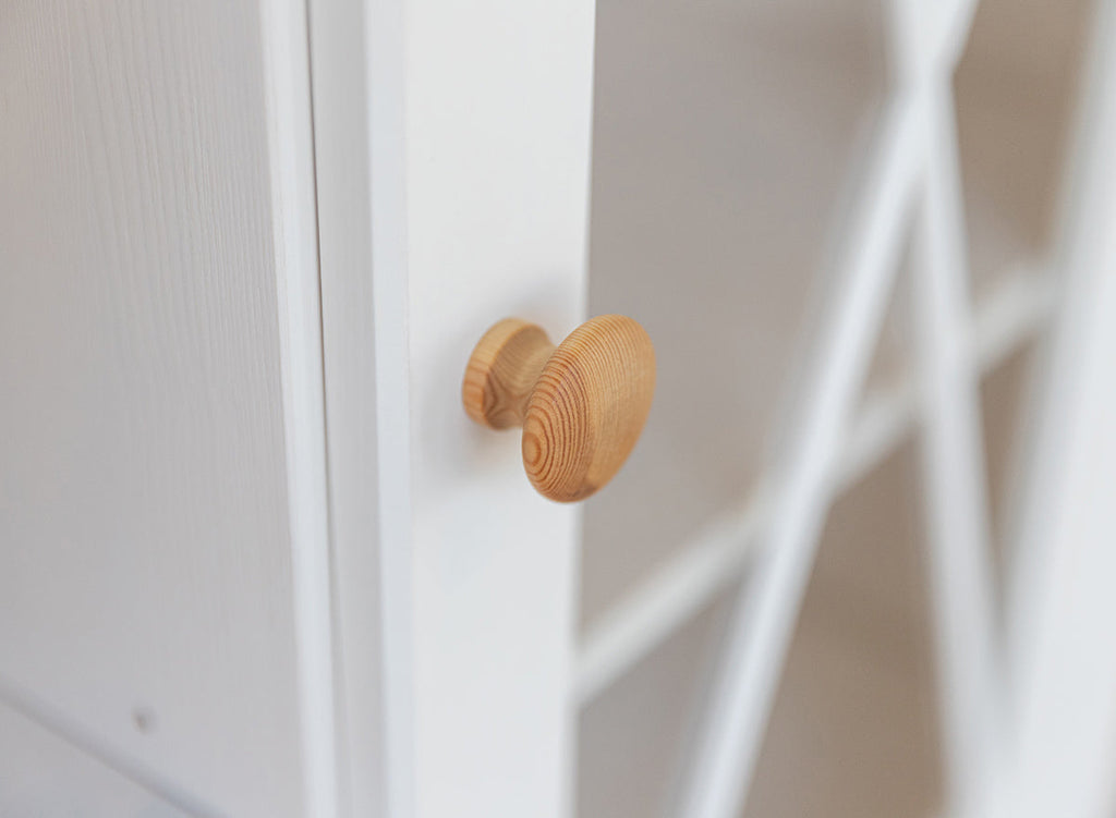 Die Vitrine aus Kiefernholz ist nicht nur langlebig und solide, sondern auch schön und exklusiv. Das liegt an den verwendeten Materialien, der Farbe und den Details, auf die wir geachtet haben. Die Oberfläche der Möbel wurde mit weißem Wasserlack mit einer Deckkraft von 85 % bedeckt, während der Kranz mit Wasserbeize und Wasserlack lackiert wurde, was die natürlichen Zeichnungen des Holzes betont. Dank der Holzgriffe – Knöpfe und Führungen mit Soft-Closing – ist der Inhalt des Möbelstücks leicht zugänglich.