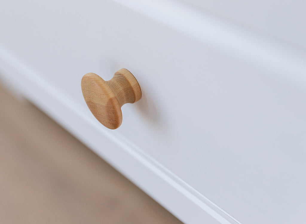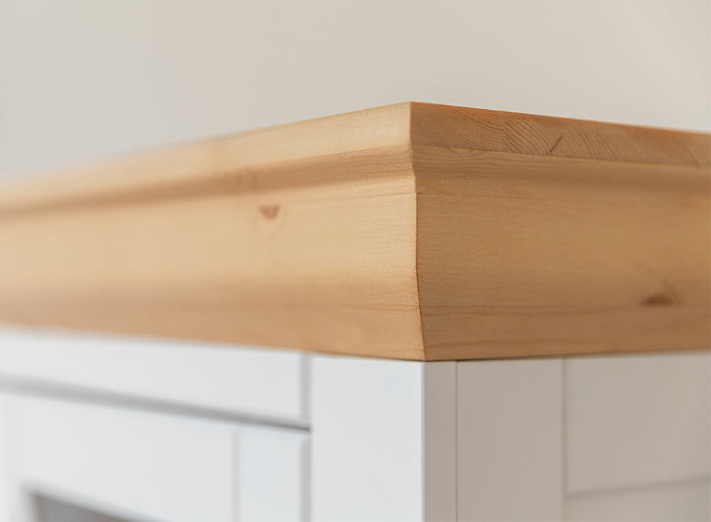 Für die Herstellung unserer Möbel verwenden wir Naturholz. Dies war bei der zweitürigen Vitrine der Fall, die aus finnischer Kiefer gefertigt ist – einer äußerst langlebigen Art, die starken Frösten und Hitze standhält und trotz Nährstoffmangels wächst. Dieses Holz ist sehr formbar und leicht zu verarbeiten, weshalb wir zahlreiche Fräsungen und Rillen ausprobiert haben.