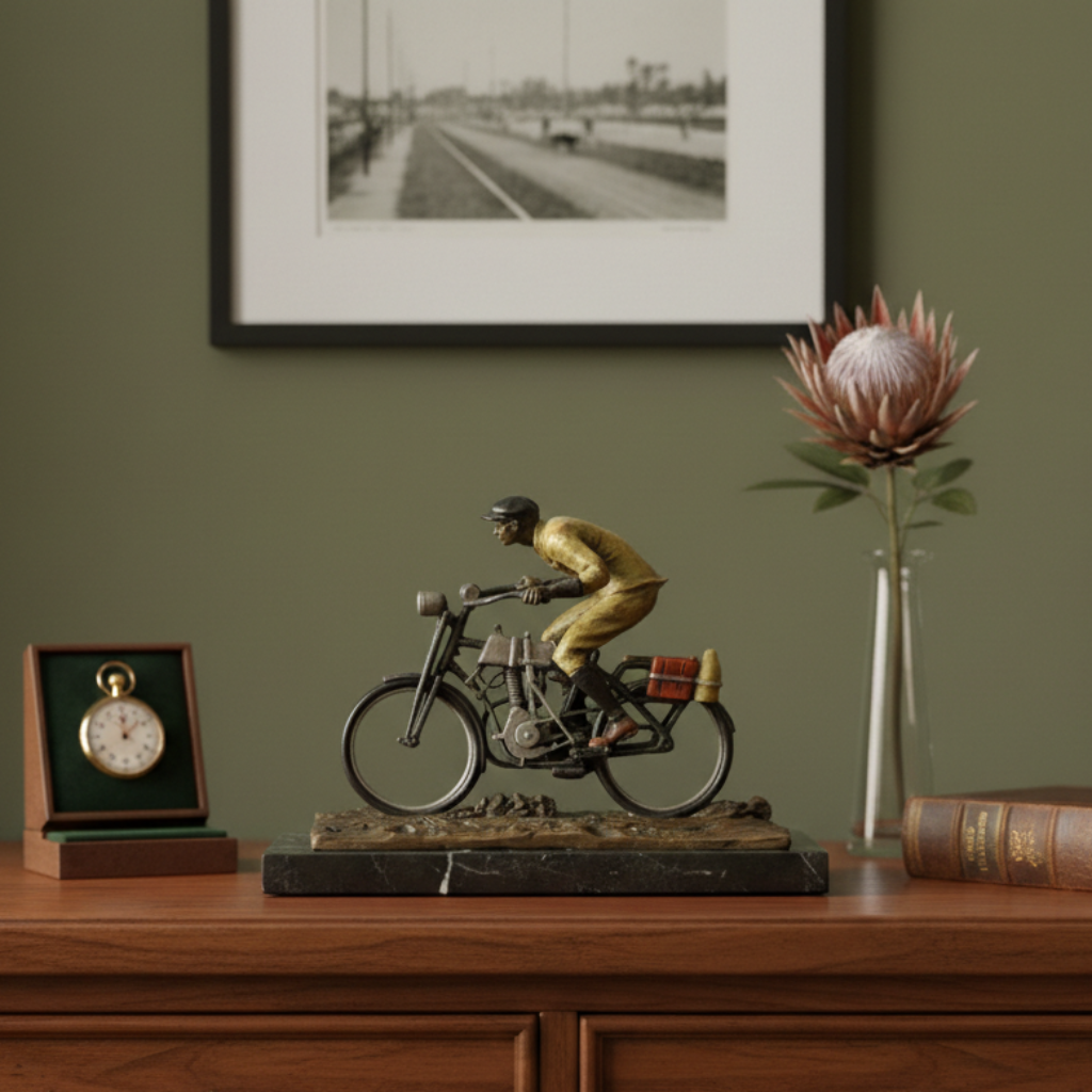 Die MotoBronze Skulptur auf Marmor ist ein eindrucksvolles Kunstobjekt, das die Leidenschaft für Geschwindigkeit und Technik stilvoll einfängt. Dargestellt ist ein Motorradfahrer in sportlicher Haltung, der sein klassisches Motorrad mit voller Konzentration steuert. Jedes Detail – von den Speichenrädern über die Motorstruktur bis hin zur Kleidung des Fahrers – ist fein herausgearbeitet und handwerklich meisterhaft in Bronze umgesetzt.