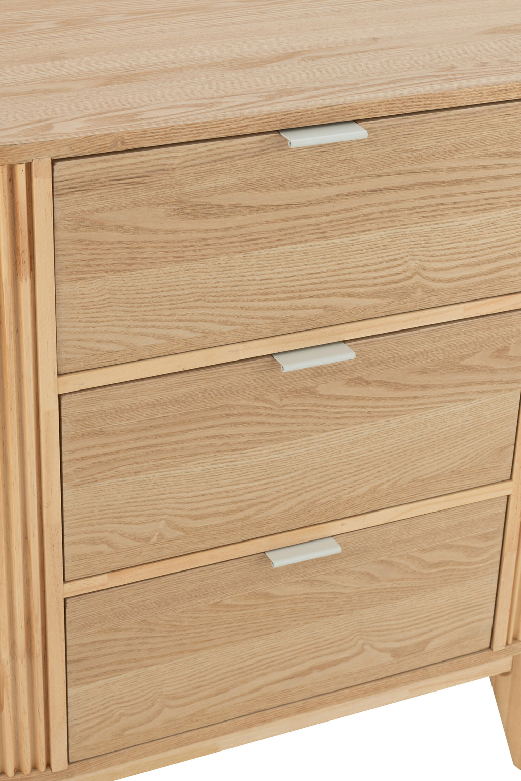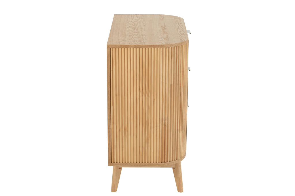 Der Schrank Rund MDF/Kiefernholz Natur ist ein stilvolles Möbelstück, das funktionale Aufbewahrung mit moderner Natürlichkeit verbindet. Die sanft gerundete Formgebung und die vertikal gefrästen Seiten verleihen dem Schrank einen hochwertigen, eleganten Ausdruck. Die natürliche Kiefernholzstruktur harmoniert perfekt mit modernen wie auch skandinavischen Einrichtungsstilen und sorgt für eine warme, einladende Atmosphäre. Mit drei geräumigen Schubladen bietet der Schrank reichlich Platz für Alltagsgegenstände, Textilien oder Dekoartikel. Dank der robusten Verarbeitung und einer Belastbarkeit von bis zu 50 kg eignet sich dieses Möbelstück hervorragend für vielfältige Wohnbereiche.