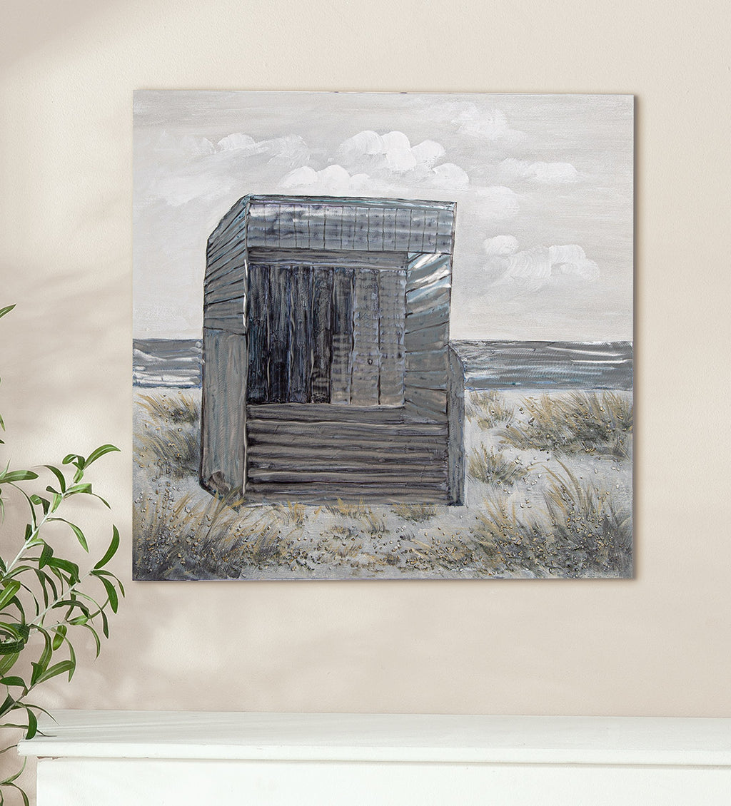 Material: Leinwand | Farbe: grau | Oberfläche: strukturiert | Motiv: Strandkorbmotiv | Besonderheiten: 3D-Optik, handgearbeitet
