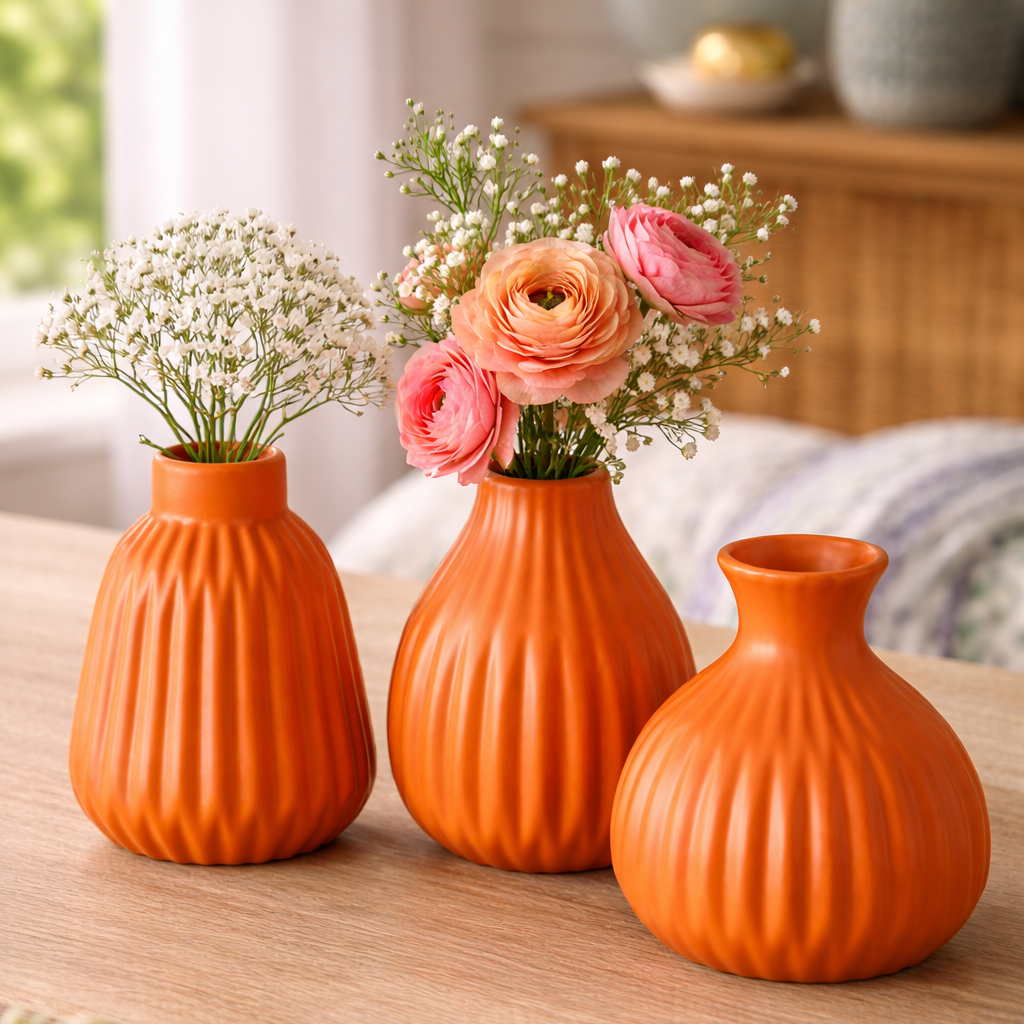 Die Vase Esko bringt frischen Wind in jedes Zuhause. In einem charmanten Set aus drei handgefertigten Vasen überzeugt sie mit ihrer warmen, matten Orangetönung und der sanften, runden Form. Die feine Prägung verleiht jeder Vase eine individuelle Note – perfekt für alle, die Design mit Charakter schätzen. Ob als stilvoller Blickfang auf dem Regal, als Farbtupfer auf dem Esstisch oder als Teil eines kreativen Arrangements: Die Vasen setzen jedes Interieur gekonnt in Szene. Ihr kompaktes Maß macht sie ideal für kleine Blumen oder als dekoratives Element ganz für sich allein.