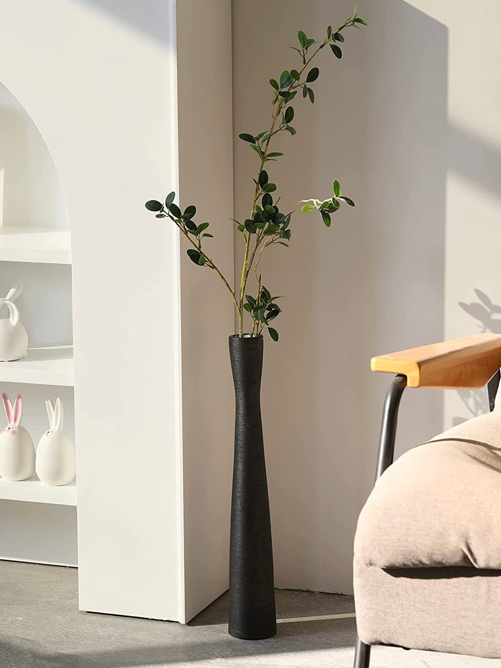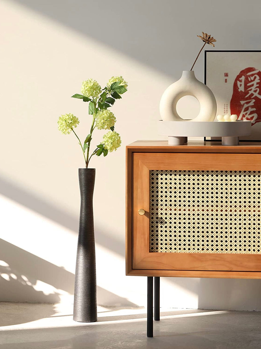 Moderne Bodenvase im schlichten Design. Schlanke Form, ideal zur Dekoration von Ecken in Wohnräumen oder als Highlight auf Sideboards. Die Vase ist aus strapazierfähiger Keramik gefertigt, die Oberfläche ist aufwändig gebürstet und hat dadurch eine leicht streifige Reliefstruktur. Der Boden ist mit einem rutschfesten Aufkleber versehen, der das Verrutschen der Vase effektiv verhindert und zudem ein Verkratzen des Fußbodens oder der Möbel verhindert. Dekoriere diese schöne Vase mit Pampasgras, Dekozweigen, Trockenblumen oder Lichterzweigen.