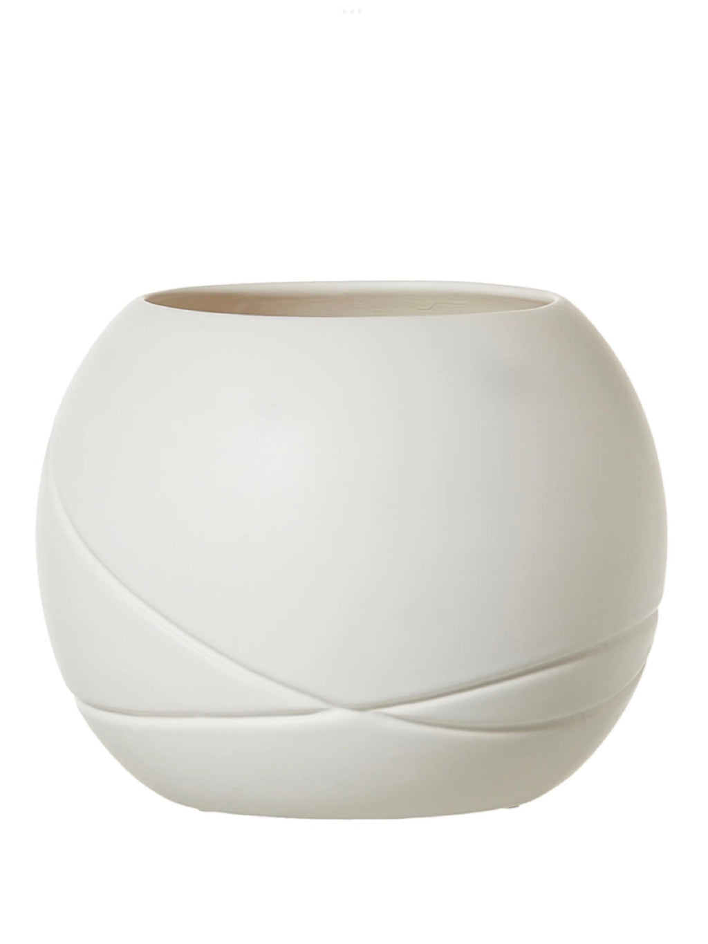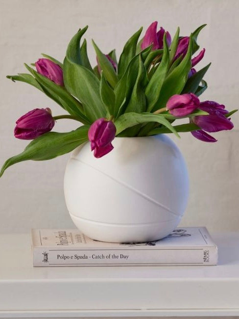 Handgefertigte Kugelvase aus nachhaltiger Keramik. Die Oberfläche ist matt und wird durch geschwungene Kerben in sanfte optische Wellenbewegung gebracht. Die Keramik wird mit Nutzung von Solarenergie und wieder aufbereitetem Wasser produziert. Besonders für kurze Blumensträuße geeignet.