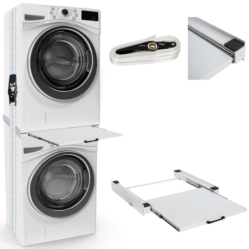 Der Zwischenbaurahmen besteht aus kaltgewalztem Stahl und ist mit Schonern versehen. Ebenfalls praktisch ist, dass im Lieferumfang ein Spanngurt enthalten ist, mit dem die übereinander gestapelten Geräte fixiert und gesichert werden können. Dadurch ist dieses Waschmaschinen-Zubehör sehr stabil und Ihre Geräte werden nicht beschädigt.