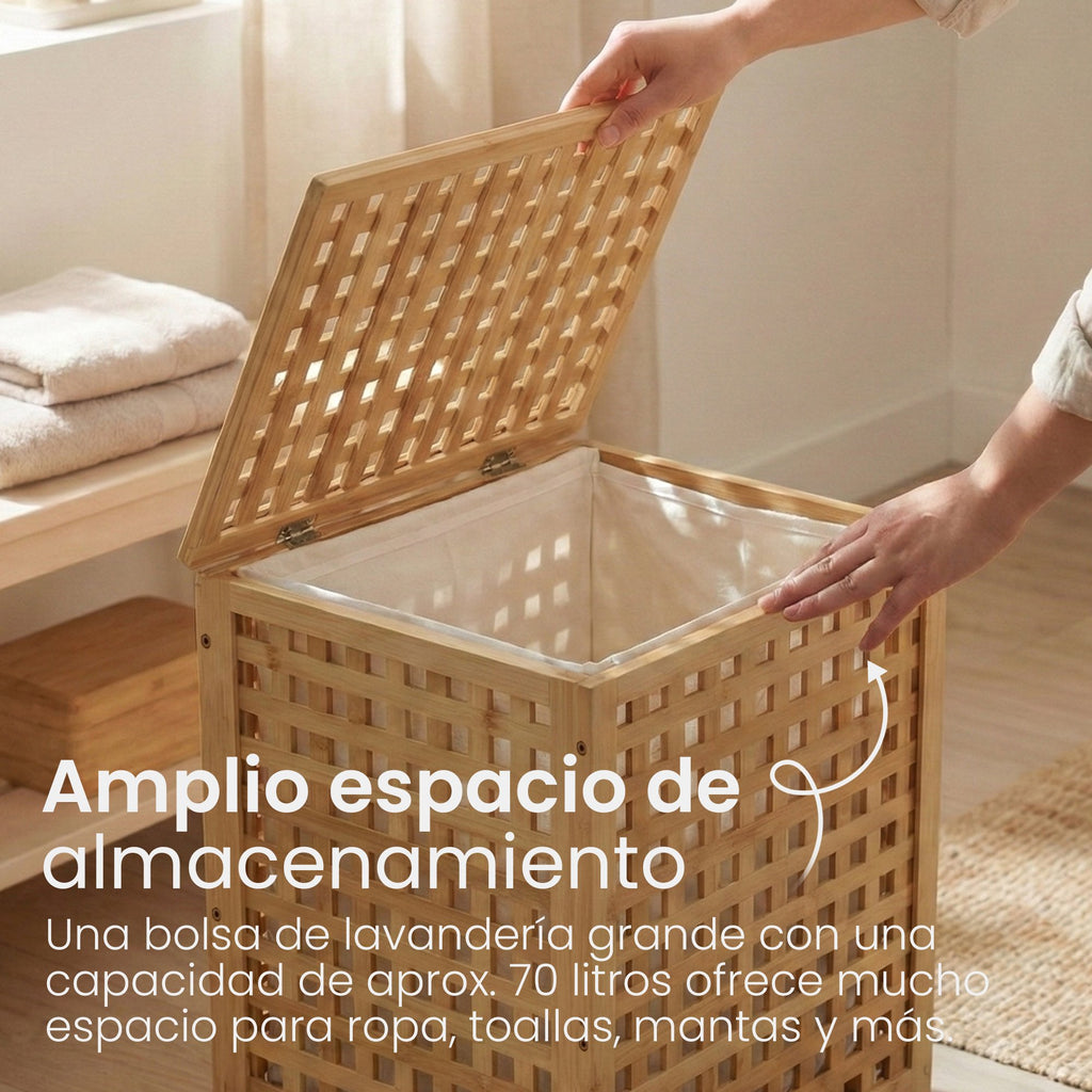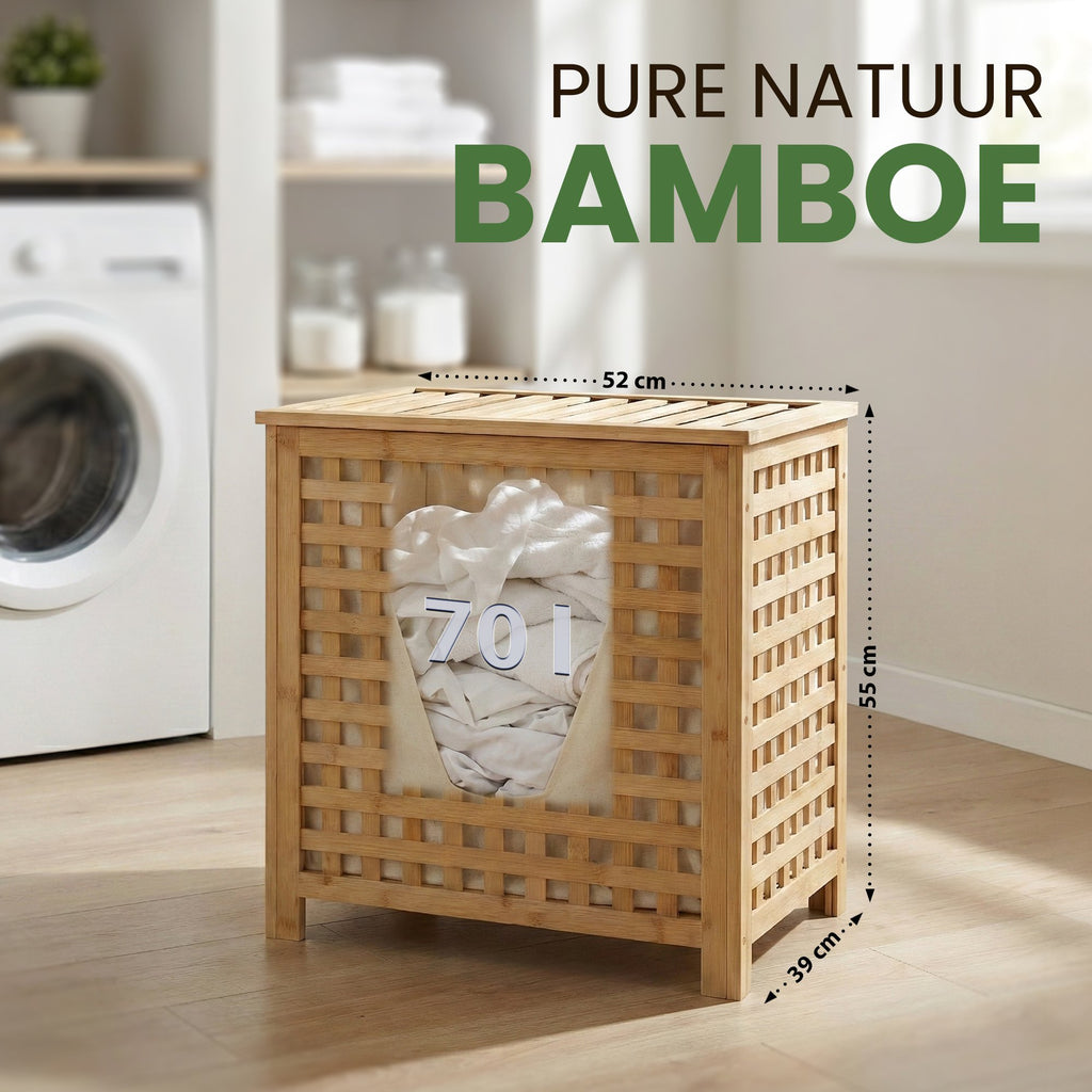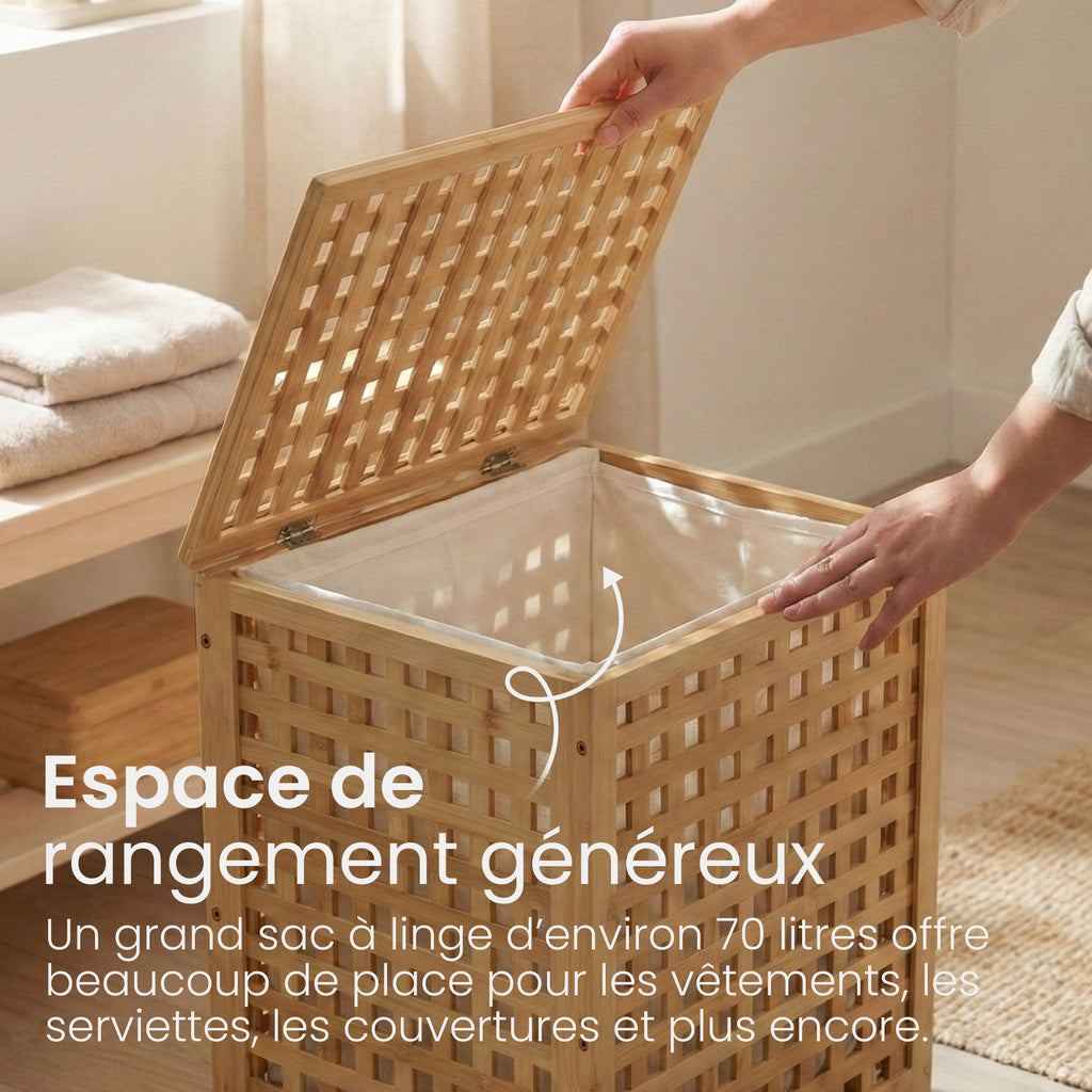 Der Wäschesammler punktet nicht nur durch Funktionalität, sondern auch durch sein ansprechendes Design. Das Gestell aus stabilem Bambus kombiniert mit dem Stoffbeutel (ca. 70 Liter) verleiht dem Raum einen natürlichen und dekorativen Akzent. Außerdem eignet sich das nachhaltige und schnell nachwachsende Bambus auch hervorragend für Feuchträume wie Badezimmer, Sauna oder Waschkeller.