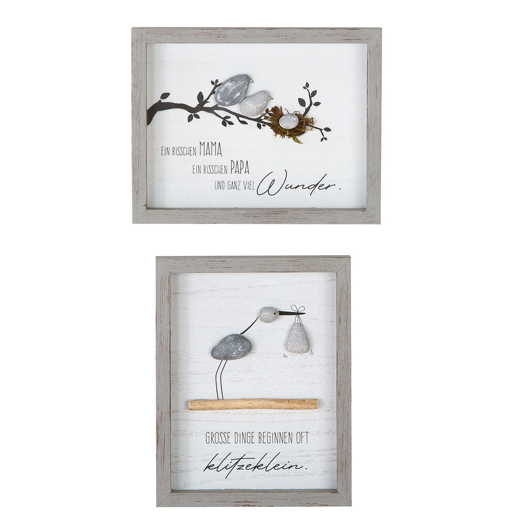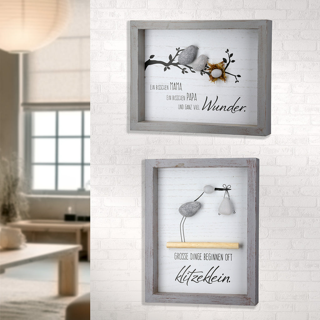 Dieses dekorative 2er Set Steinbilder verbindet natürliche Materialien mit liebevollen Botschaften und sorgt für eine harmonische Atmosphäre in jedem Wohnraum. Die aufeinander abgestimmten Motive ergänzen sich stilvoll und entfalten gemeinsam eine besondere Wirkung an der Wand. Durch die Kombination aus grauem Rahmen, feinen Details und plastischer 3D Optik entsteht eine dezente Tiefe, die dem Arrangement eine hochwertige Ausstrahlung verleiht. Die gefühlvollen Sprüche und die ruhige Gestaltung machen dieses Set zu einem eleganten Blickfang für moderne und klassische Einrichtungen. Ideal für Wohnbereiche, Flur oder Schlafzimmer geeignet.