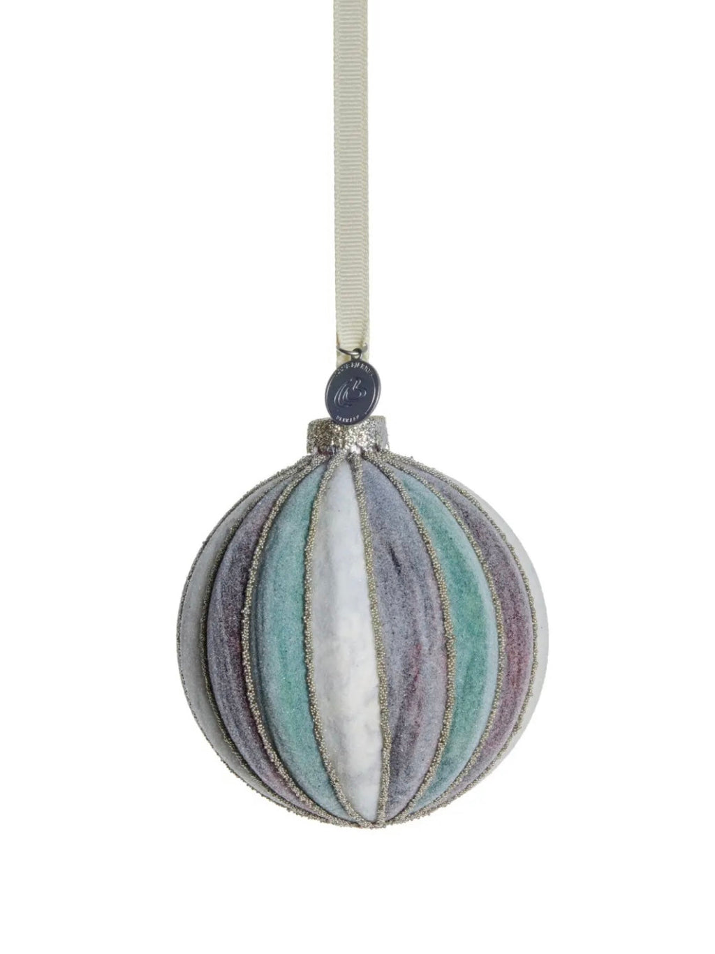 Wunderschöner Weihnachtsschmuck für ein unvergessliches Fest. Aufwändige Handarbeit. Aus mundgeblasenem, mit Glitter dekoriertem Glas. Die Weihnachtskugel wird mit einem Textilband aufgehängt.