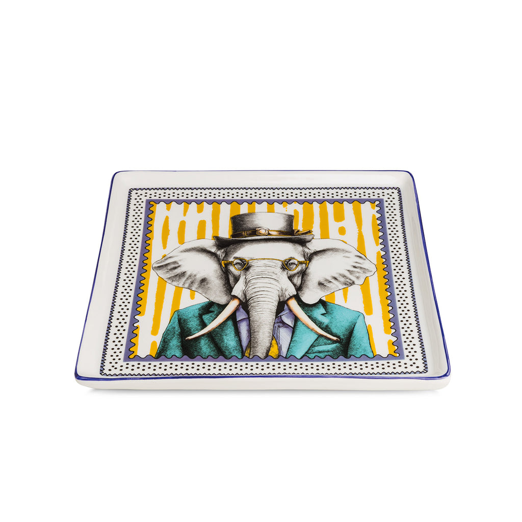 Das 4er Set Wise Elephant vereint außergewöhnliches Design mit tiefer Symbolik. Der quadratische Porzellanteller zeigt einen stilvoll gekleideten Elefanten im Zylinder vor einem auffälligen Streifenhintergrund – ein echter Hingucker auf jedem gedeckten Tisch.